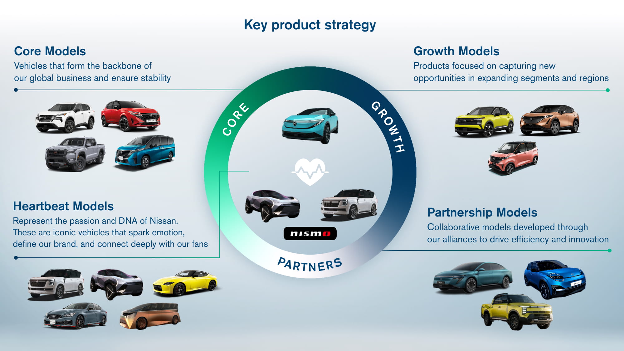 Our future lineup will be organized into four distinct categories, each playing a vital role in Nissan's growth: Heartbeat models that represent our brand's identity, Core vehicles that ensure stability, Growth models that captures emerging opportunities, and Partnership models developed with trusted partners. Together, they form more attractive and competitive portfolio built for the needs of today and tomorrow.