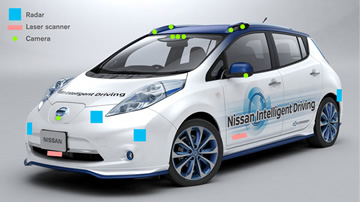 今回の実験車両は実際の交通環境で検証を行い、市販化に向けたシステムの信頼性向上を図ることを目的に開発したもので、今後日本だけでなく、海外での公道テストも実施します。同車両は電気自動車「日産リーフ」をベースに、ミリ波レーダー、レーザースキャナー、カメラなど特長の異なる複数のデバイス、高速チップ、専用のHMI(ヒューマンマシンインターフェイス)などが搭載されており、ハイウェイだけでなく一般道を含んだルートにおいて、ナビゲーションシステムで設定した目的地まで自動走行することができます。
