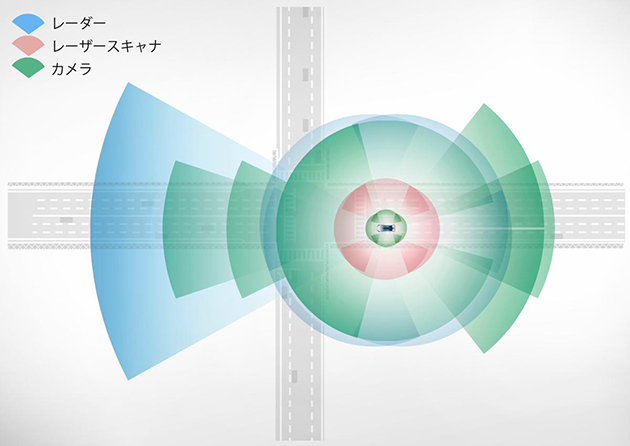 一般道での自動運転を可能とするため、今回2つの革新的な技術を新たに開発しました。一つは世界最先端の小型・高性能な量産試作段階のレーザースキャナーです。高精度な3次元計測により、車両周囲の物体との距離を正確に把握しながら安全に走行することができます。もう一つは、遠方までの360度視野を持つ8カメラシステムで、交差点やきついカーブ路を走行するときにクルマの進む方向を的確に決めることが可能となりました。これらの革新的な技術を同車両に搭載することで、複雑な一般道の道路環境の中でも熟練したドライバーが運転するような安全で滑らかなクルマの動きを実現しています。