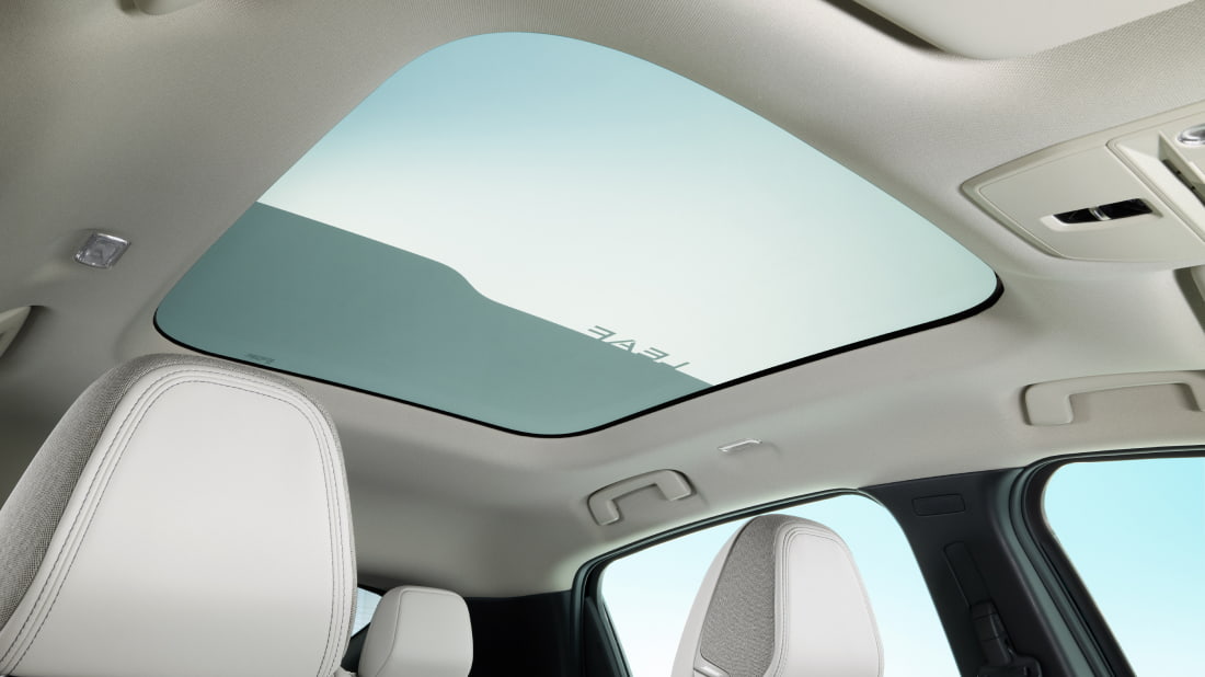 日産初となる調光パノラミックガラスルーフには遮熱技術が搭載され、室内に入る光を調整しながら景観を楽しむことができます。PDLC(高分子分散型液晶)技術により、ボタン操作ひとつで光の量をコントロールすることができ、いつでも明るく快適な室内空間を楽しむことができます。