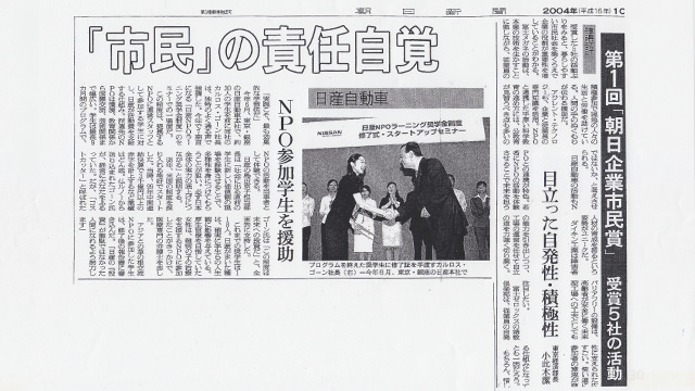 独自の社会貢献プログラムのひとつに『日産NPOラーニング奨学金制度』があった。これは、学生がNPOでインターンを経験し、その労働の報酬は日産が奨学金として支給するというもの。「若者に知的労働の機会を提供したいと考え、1998年に創設しました。NPOには専門性と独自の行動原理があります。それらに触れる機会を若者に提供したかったのです」。当時の社長はこれを「若者への投資」と呼んで、毎年自ら、修了証を学生たちに手渡した。