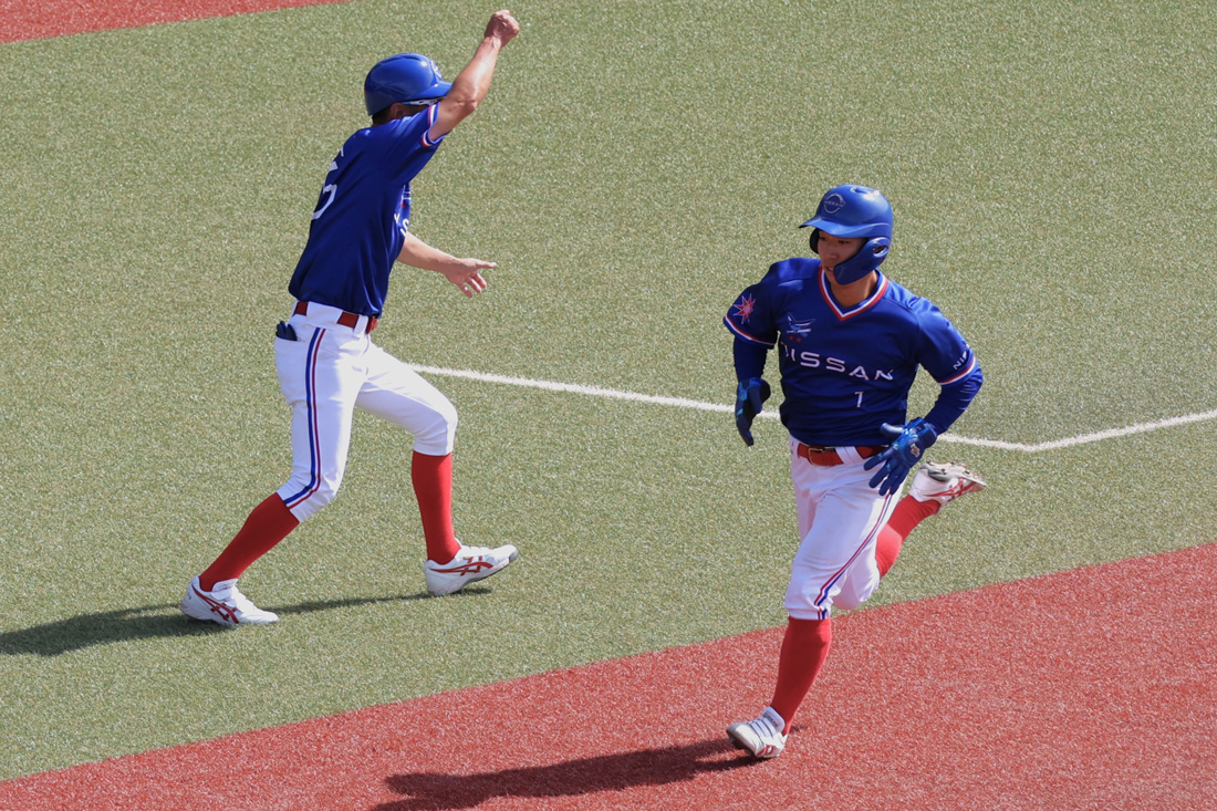 日産は1点を追う8回表、1死から小柴選手が四球を選んだ後、宮川選手がセーフティーバントを成功させてチャンスを拡げると、好調の梅澤選手が三塁打で二者を帰して2-1と逆転に成功しました。続く石毛選手も右中間への2塁打で3-1とします。